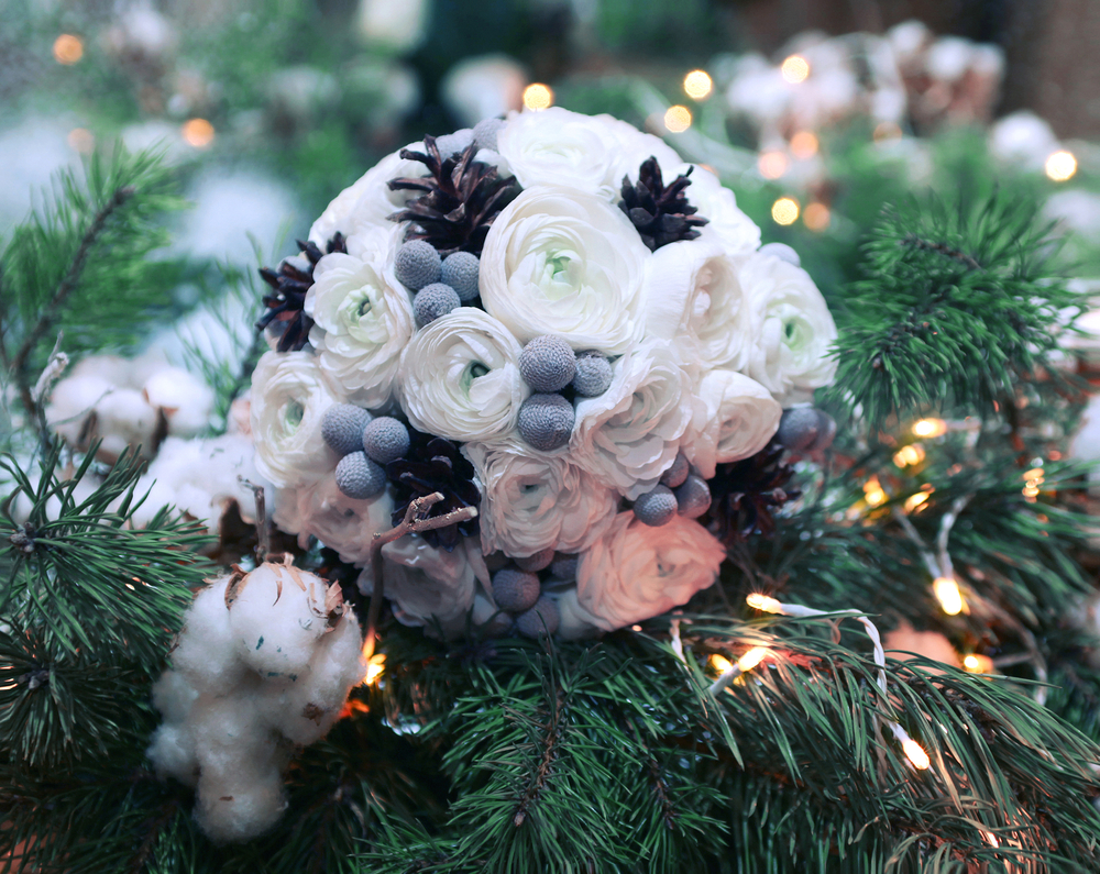 Beautiful wedding flowers accented with bits of seasonal texture can be a gorgeous combination. Add pine cones, winter berries and cotton to a bouquet of white roses for a snowy Christmas look. Use as bouquets or place with garland and holiday lights for a Christmas feel to your centerpieces.
